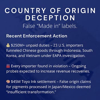 The Toyo Ink settlement demonstrates origin deception consequences. The Japanese company paid $45 million to resolve allegations that finishing work in Japan and Mexico was “insufficient to constitute substantial transformation” for Chinese and Indian pigments, making origin declarations false.