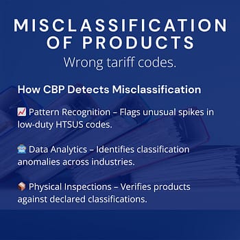 CBP’s analytical capabilities increasingly identify classification anomalies through pattern recognition. Unusual spikes in imports under specific HTSUS codes, particularly lower-duty classifications, trigger investigation. The agency also conducts physical inspections to verify that imported products match declared classifications.