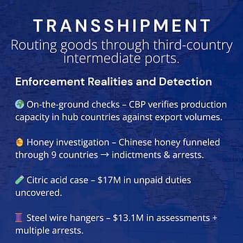 CBP conducts on-the-ground verifications in transshipment hub countries, analyzing production capabilities against export volumes. The agency’s honey transshipment investigation revealed Chinese honey routed through Russia, India, Indonesia, Malaysia, Mongolia, the Philippines, South Korea, Taiwan, and Thailand—leading to numerous indictments and arrests.