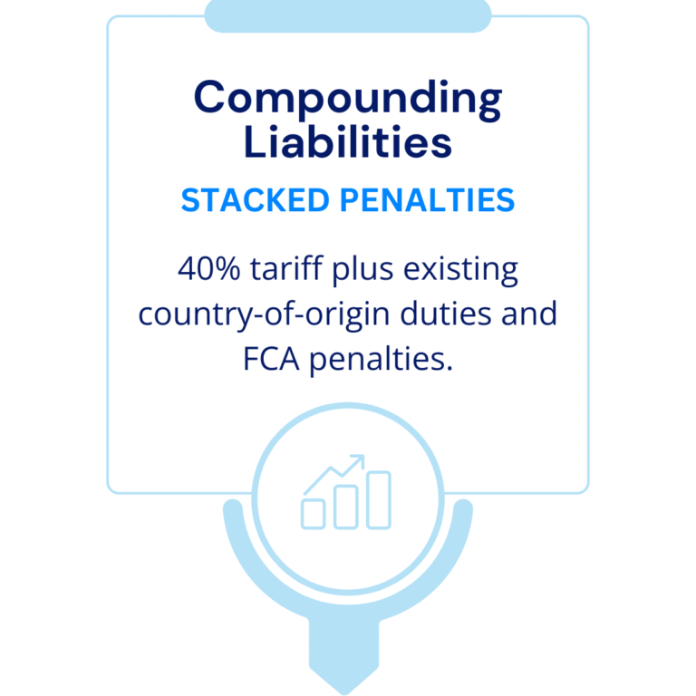 President Trump’s July 31, 2025 Executive Order established a revolutionary 40% penalty tariff for goods determined to be transshipped, representing the most aggressive anti-transshipment measure in U.S. history. Key provisions include: