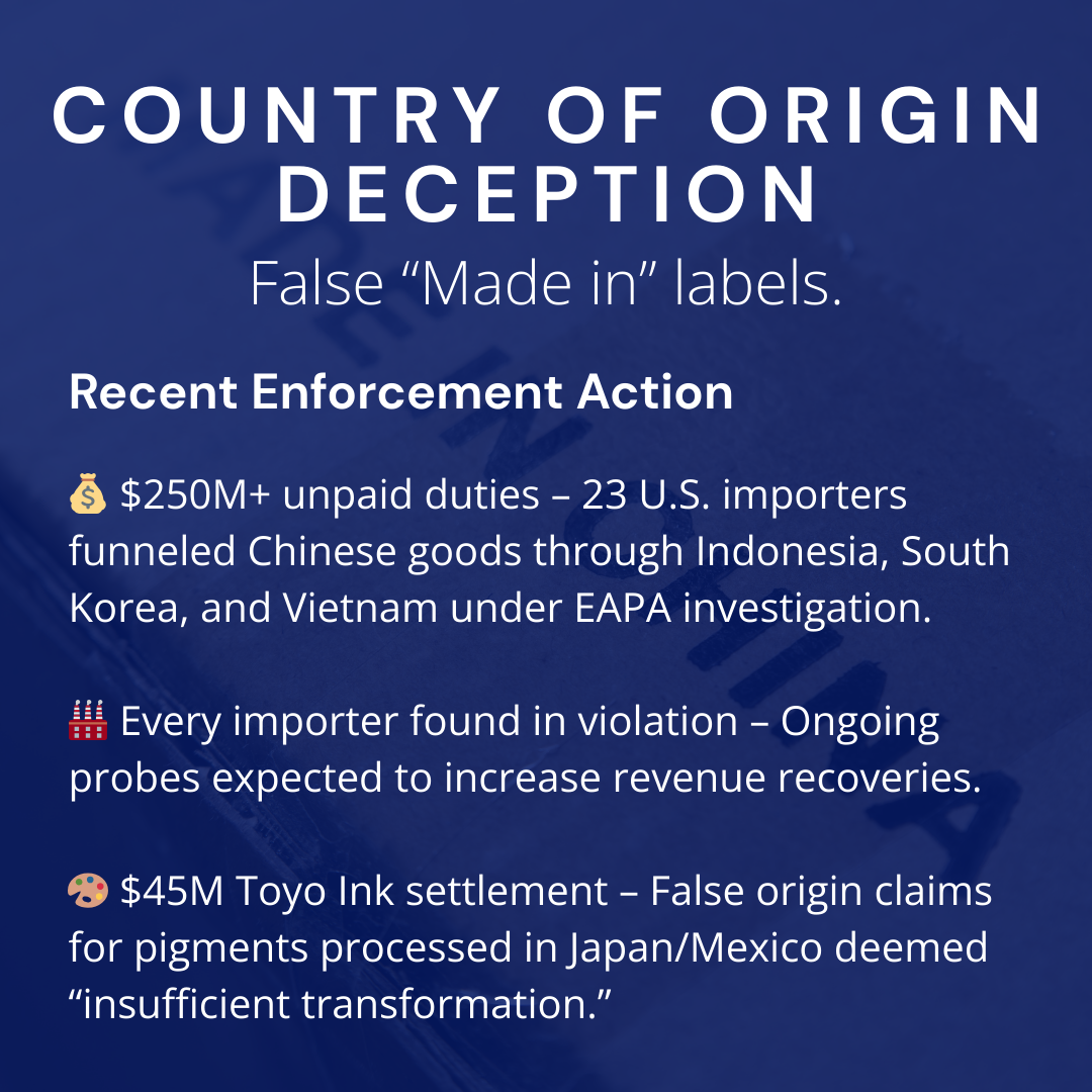 The Toyo Ink settlement demonstrates origin deception consequences. The Japanese company paid $45 million to resolve allegations that finishing work in Japan and Mexico was “insufficient to constitute substantial transformation” for Chinese and Indian pigments, making origin declarations false.