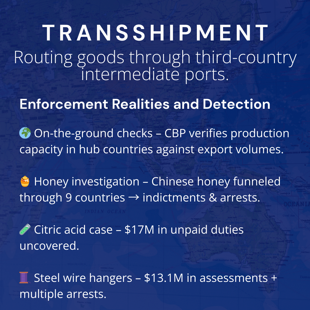 CBP conducts on-the-ground verifications in transshipment hub countries, analyzing production capabilities against export volumes. The agency’s honey transshipment investigation revealed Chinese honey routed through Russia, India, Indonesia, Malaysia, Mongolia, the Philippines, South Korea, Taiwan, and Thailand—leading to numerous indictments and arrests.